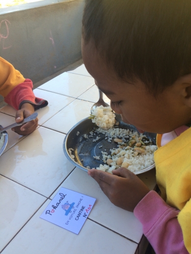 A 9h30, le repas est prêt et Mme Vero, Mme Voahangy, Mme Dina et Mme Chantal, nos quatre cantinières sont en place pour accueillir et servir les enfants. Je vous laisse apprécier les photos des enfants à table, mes commentaires seraient forcément en-dessous de l’intensité de la réalité.