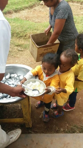 Chaque repas, à l’intention de ces 875 enfants, est composé de 120 kg de riz, 24 kg de tsaramaso (haricots blancs) ou voanjobory, de hanan-drano (cresson), 3 kg de tomates, 1 kg de petits oignons, 8 litres d’huile et du bouillon de poulet ou de bœuf.